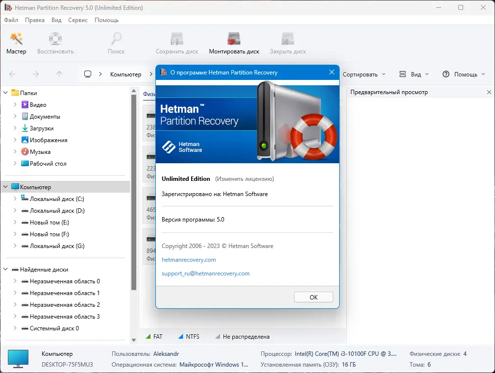 Hetman Partition Recovery — универсальный инструмент, объединяющий комплекс алгоритмов для полного восстановления данных. Он восстанавливает имена, атрибуты, содержимое файлов и структуру каталогов, а также обнаруживает все ранее созданные разделы диска для дальнейшего анализа. Поддерживая файлы и диски Windows, MacOS, Linux и Unix, программа исправляет ошибки логической структуры дисков и возвращает данные быстрее, чем вы досчитаете до трех. Удобный интерфейс и русскоязычный файловый помощь делают работу с программой максимально простым как для профессионалов, так и для неопытных пользователей.