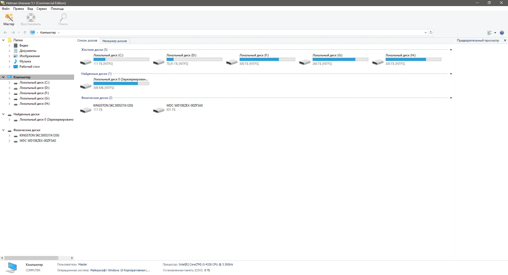Hetman Uneraser предназначена для быстрого и надежного восстановления файлов, удаленных с жестких дисков, карт памяти SD, MicroSD, Compact Flash, USB-флешек и других носителей информации. Интерфейс утилиты выполнен в стилистике окна «Мой компьютер» на русском языке, что делает процесс восстановления максимально простым и понятным. Пользователю достаточно выбрать нужный файл или папку и нажать кнопку «Восстановить», чтобы вернуть информацию. Программа подходит как для начинающих, так и для профессиональных пользователей, обеспечивая высокую степень надежности и удобства.