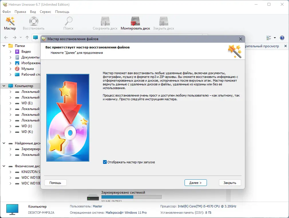 Hetman Uneraser — это мощная утилита, которая восстанавливает удаленные с жестких дисков, карт памяти SD, MicroSD, Compact Flash, USB-накопителей и других устройств файлы. Интуитивно понятный интерфейс, напоминающий окно «Мой компьютер», позволяет быстро найти и восстановить нужные документы, фотографии, видео и архивы. Для этого достаточно выбрать файл или папку и нажать кнопку «Восстановить» — и процесс возврата данных будет выполнен за считанные минуты.