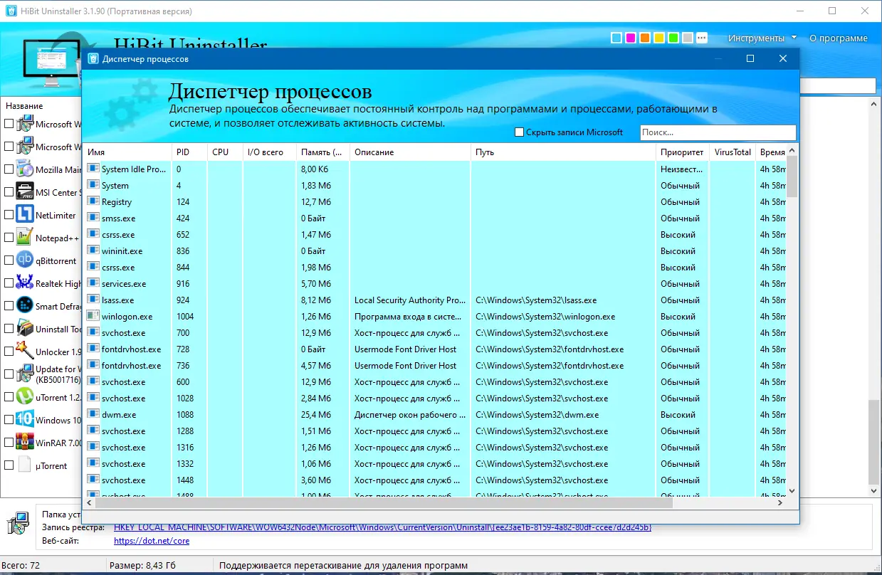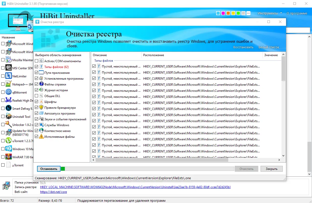 HiBit Uninstaller — это современное решение для быстрого и полного удаления программ из Windows. Благодаря интуитивно понятному интерфейсу, пользователи могут легко деинсталлировать ненужные приложения, включая системные и приобретённые через Windows Store. После каждого удаления программа проводит тщательное сканирование на наличие остатков и хвостов, что обеспечивает чистоту системы и предотвращает возможные сбои. Также доступна расширенная функция сканирования для более углубленной очистки.