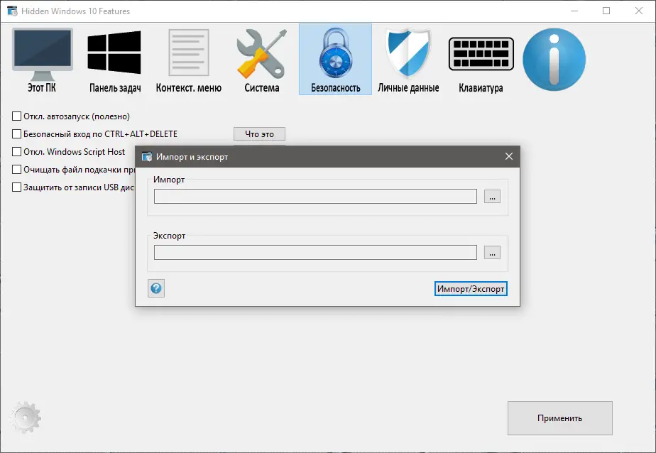 Этот инструмент предоставляет доступ к множеству скрытых функций Windows 10, которые ранее могли быть доступны только через сложные операции с реестром или сторонними скриптами. Возможности программного обеспечения позволяют экспортировать и импортировать настройки, что значительно упрощает их применение на нескольких компьютерах или создание резервных копий перед изменениями системы. Благодаря русификации интерфейса, программа становится максимально понятной и удобной даже для пользователей с базовым знанием технических аспектов Windows.