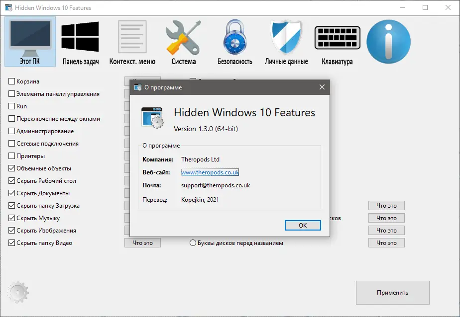 Hidden Windows 10 Features — это универсальный инструмент для быстрой настройки и активации скрытых функций операционной системы Windows 10, 8/8.1, Windows 7, 11 и их вариаций для x32 и x64 Bit. Программа позволяет легко управлять настройками без необходимости редактирования реестра вручную, что делает её удобной как для профессиональных администраторов, так и для обычных пользователей.