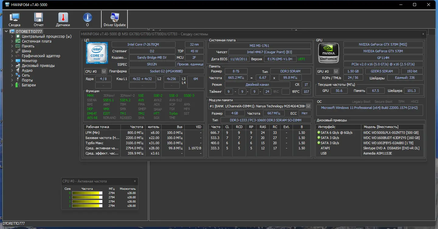 - Просмотр характеристик процессора, материнской платы, видеокарт, дисков и датчиков