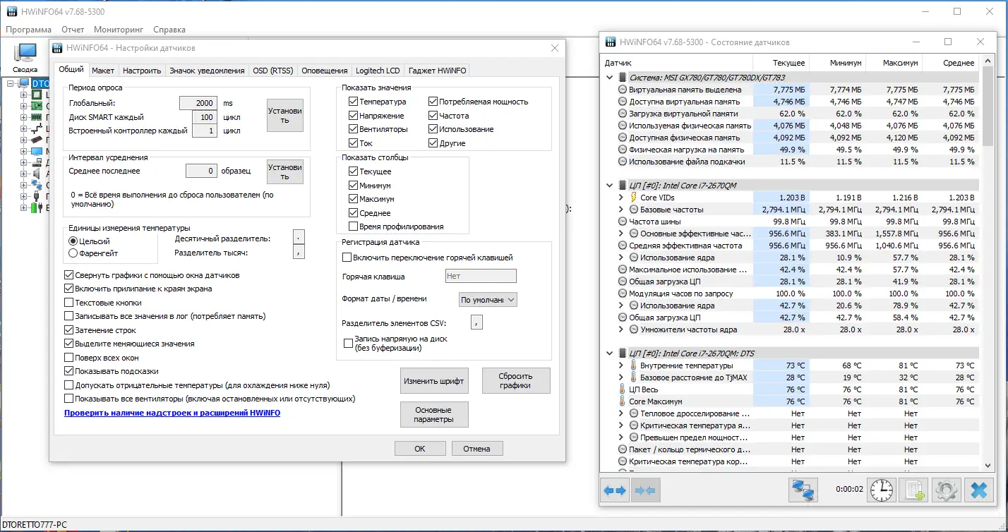 - Просмотр текущих, минимальных, максимальных и средних значений температуры и потребления ресурсов процессора, видеокарт и других устройств.