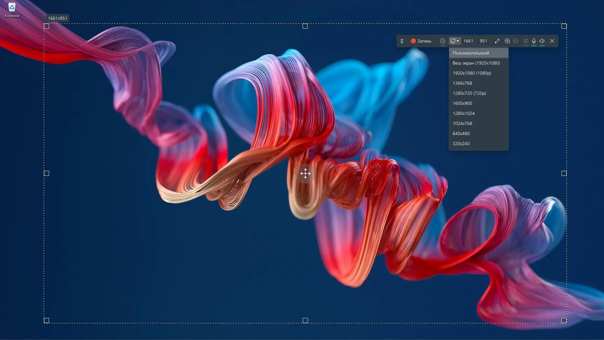 - Запись происходящего на экране с возможностью выбора любой области или всей поверхности монитора.