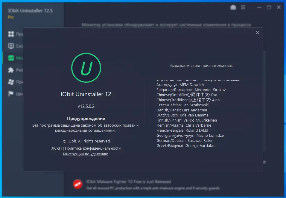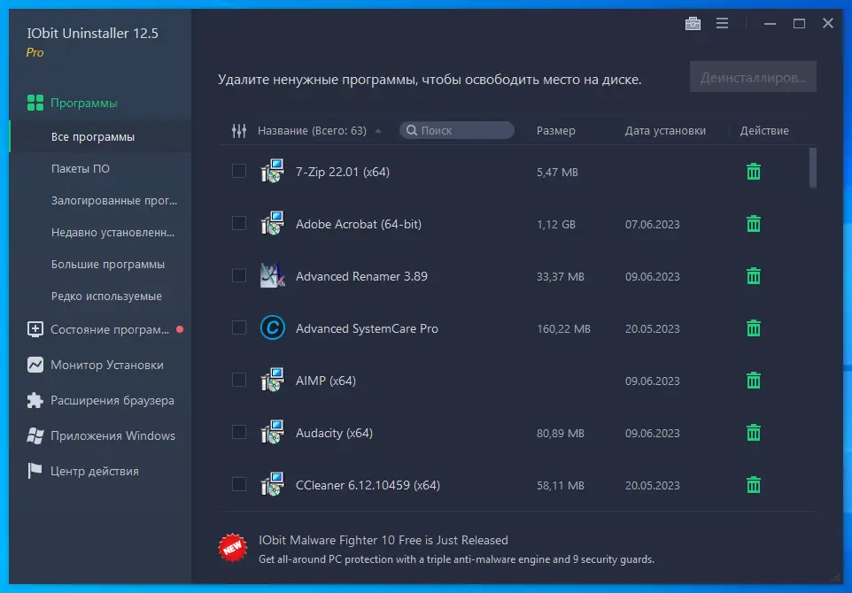 IObit Uninstaller Pro представляет собой удобный и мощный инструмент для удаления ненужных программ, панелей инструментов и плагинов без остатков. Он обнаруживает и классифицирует все установленные приложения, позволяя выполнять пакетное удаление всего одним щелчком мыши. Благодаря функциям «Мощное сканирование» и «Принудительное удаление», пользователь избавляется от остаточных файлов, папок и записей в реестре, а также удаляет следы панелей инструментов. Мгновенно устанавливается и легко в использовании. В случае необходимости удаления важных файлов, предусмотрена функция «Шредер файлов», которая гарантированно уничтожает выбранные данные без возможности восстановления.