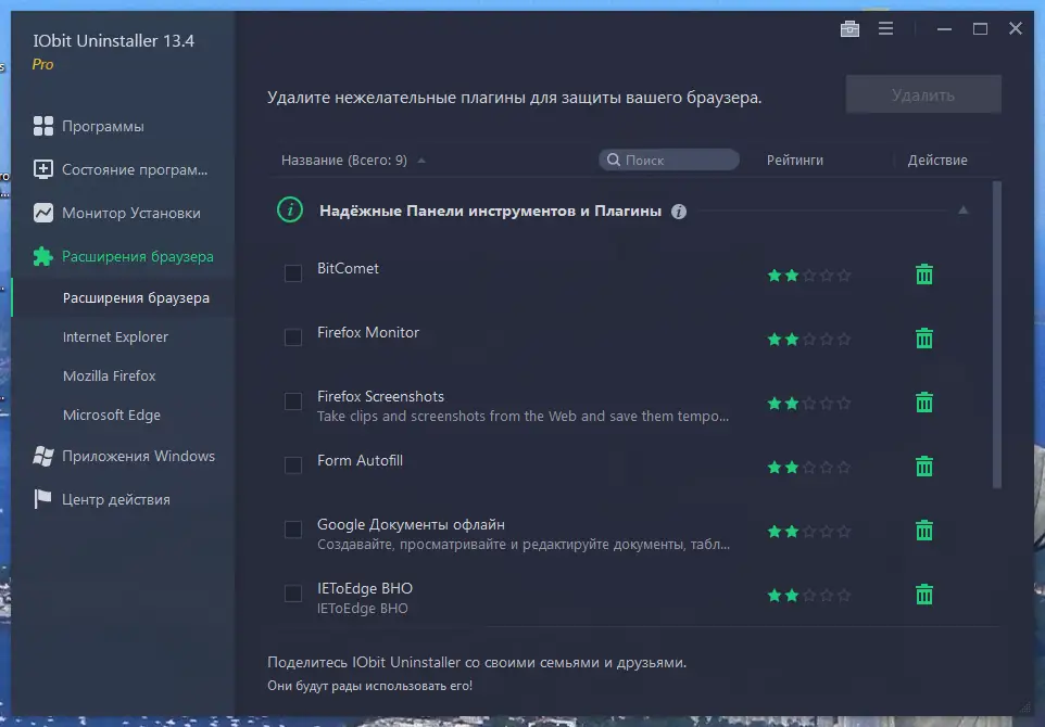 - Удаление раздражающих панелей инструментов и нежелательных плагинов браузеров