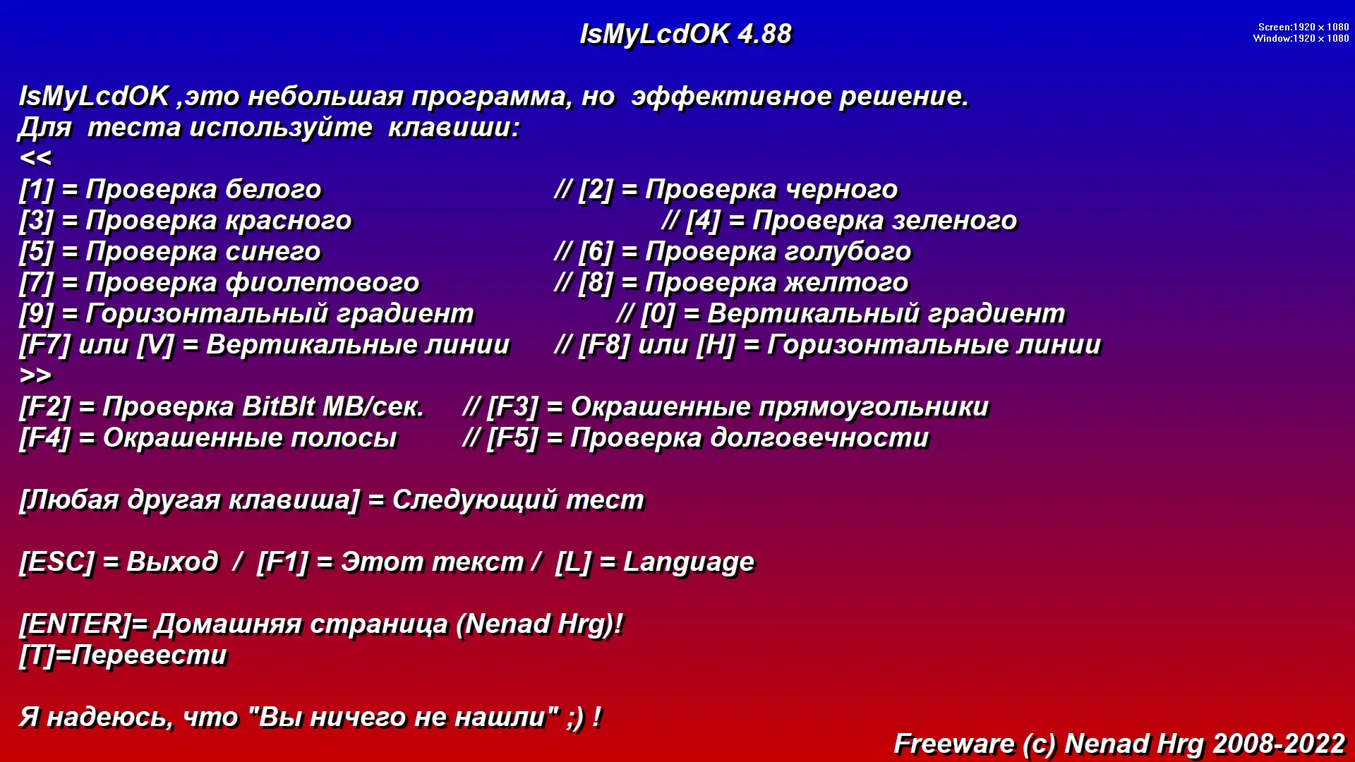 IsMyLcdOK — бесплатная портативная программа для быстрого обнаружения битых и поврежденных пикселей на LCD мониторах, не требующая инсталляции и легко переносимая на различных носителях.