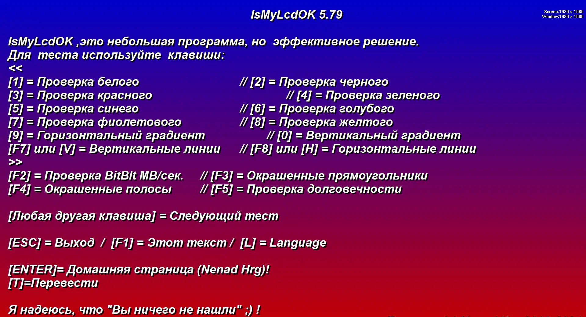IsMyLcdOK — небольшая бесплатная программа, предназначенная для быстрого обнаружения дефектов на экране LCD мониторов. Не требует установки, обладает интуитивным интерфейсом и может использоваться с различных носителей, что делает её удобным инструментом для диагностики любых мониторов. Программа демонстрирует смену цветов на экране, позволяя выявить даже самые незаметные поврежденные пиксели, так как определённые цвета помогают лучше визуализировать дефекты.