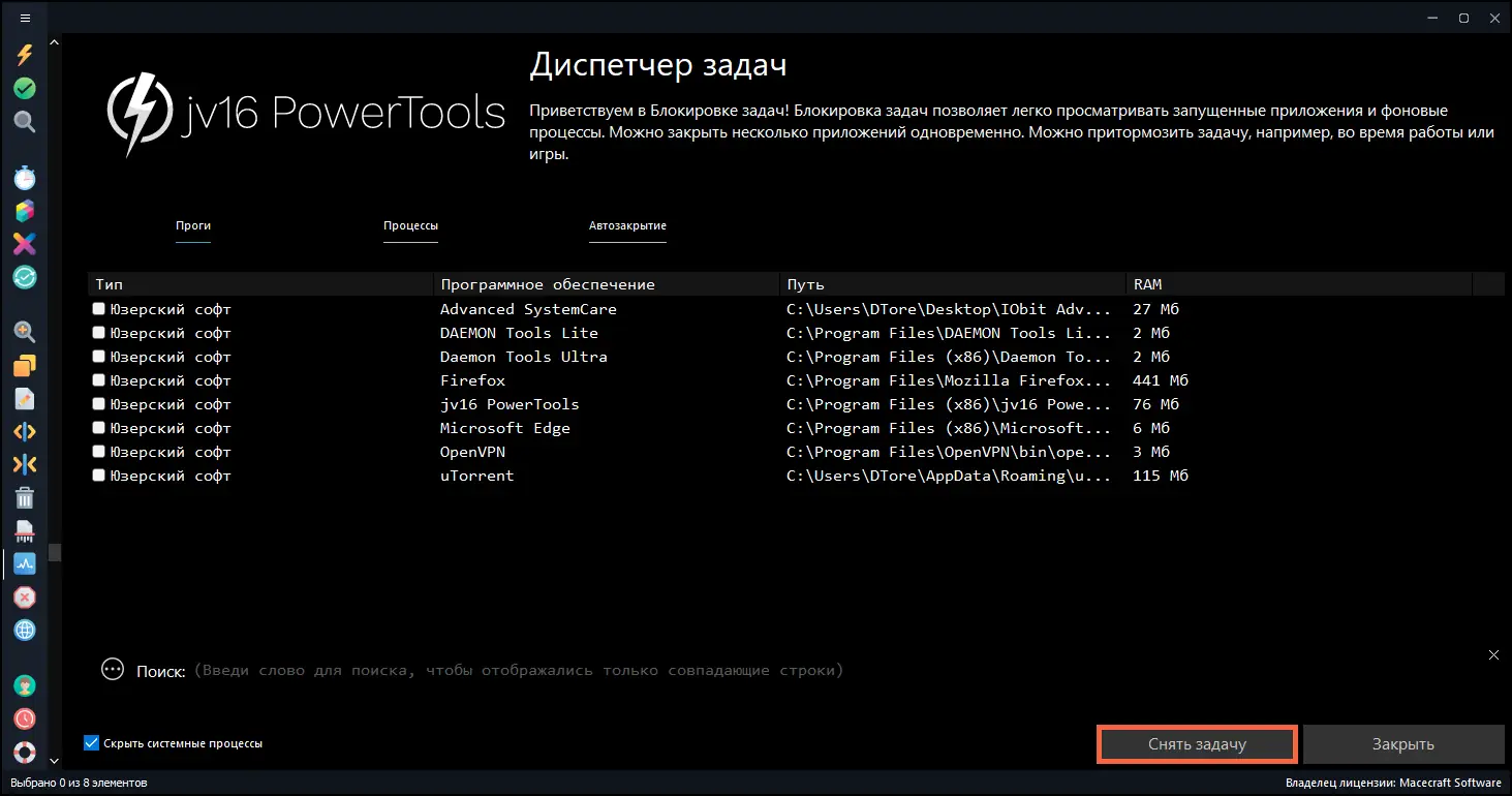- Управление автозагрузкой и меню Пуск, мониторинг системных процессов.