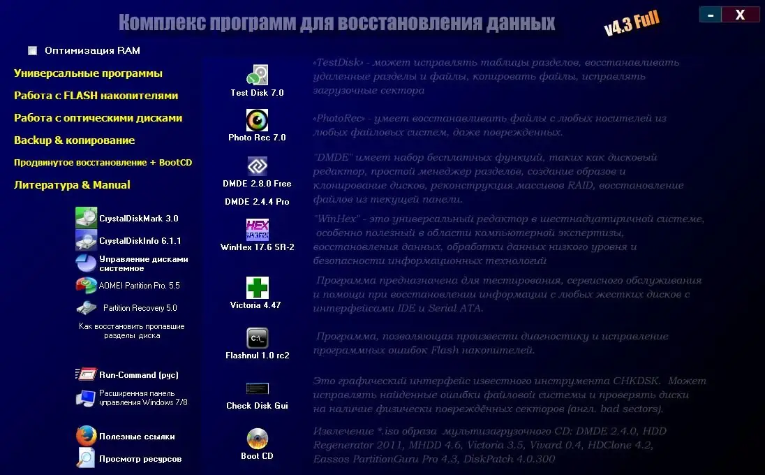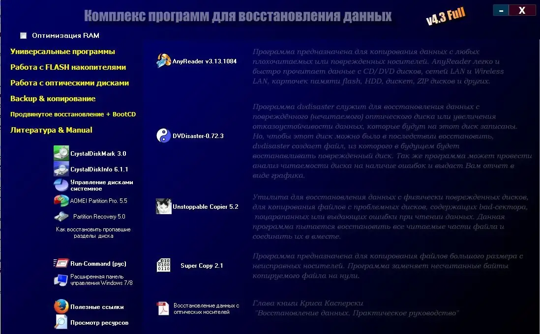 В обновлённой версии добавлены программы Aidfile recovery software professional 3.6.5.8 и 7-Data Data Recovery Suite 3.0, а также улучшены механизмы восстановления данных с физических повреждений и сложных сбоев оборудования. Обновление включает расширенную поддержку файловых систем и новые методы анализа носителей для повышения эффективности восстановительных процедур.