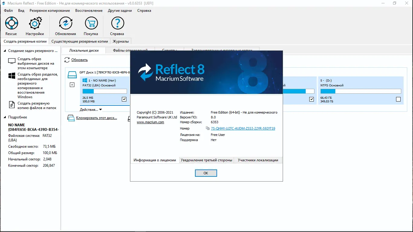 Macrium Reflect Free обладает простым в использовании, но при этом стильным и профессиональным интерфейсом. Основная задача программы — создание резервных копий системы, разделов, отдельных файлов или папок. В процессе установки пользователь подтверждает лицензию, вводя имя, фамилию и email, а также может ознакомиться с электронными справочными материалами. Возможность выбрать место хранения резервных копий — на жестком диске, сетевом ресурсе или DVD — делает инструмент универсальным. Программа поддерживает создание образов «на лету» без перезагрузки системы, имеет встроенный планировщик резервирования и функцию верификации готовых образов для уверенности в их целостности.