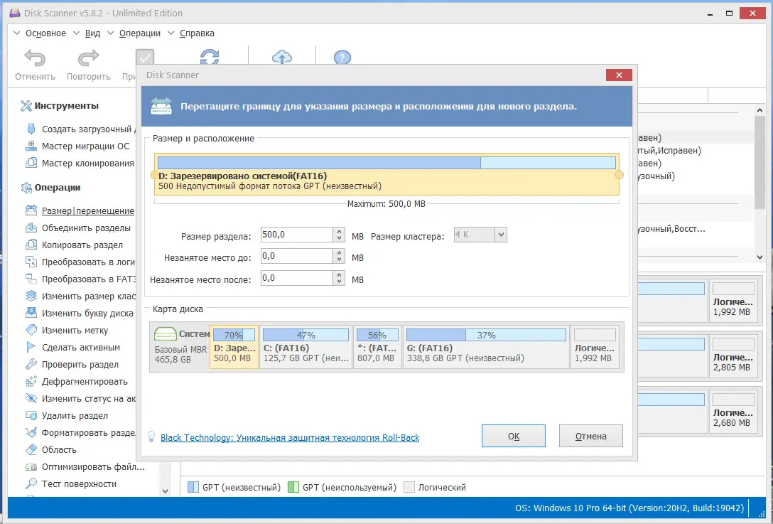 - Высокоскоростное перемещение и изменение размеров разделов с гарантией сохранности данных.