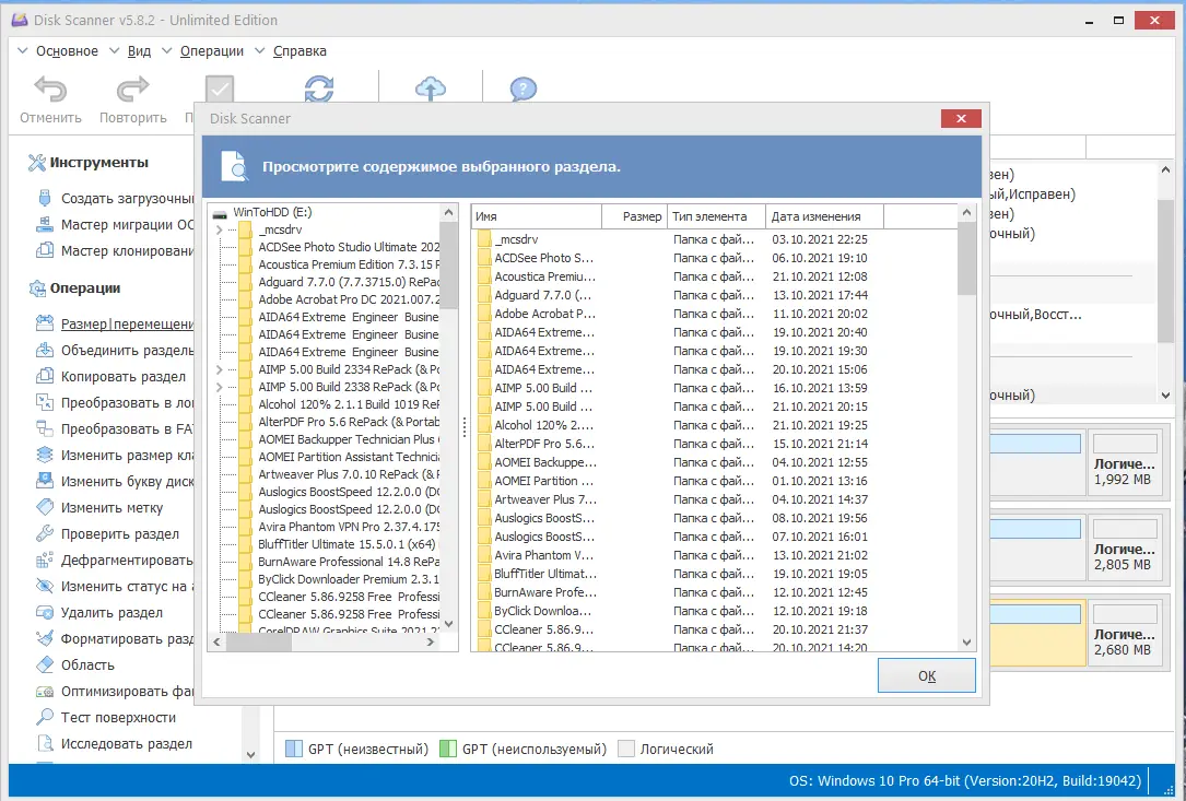- Работа с дисками объемом свыше 2 Тб и поддержка систем MBR и GPT для максимальной совместимости.