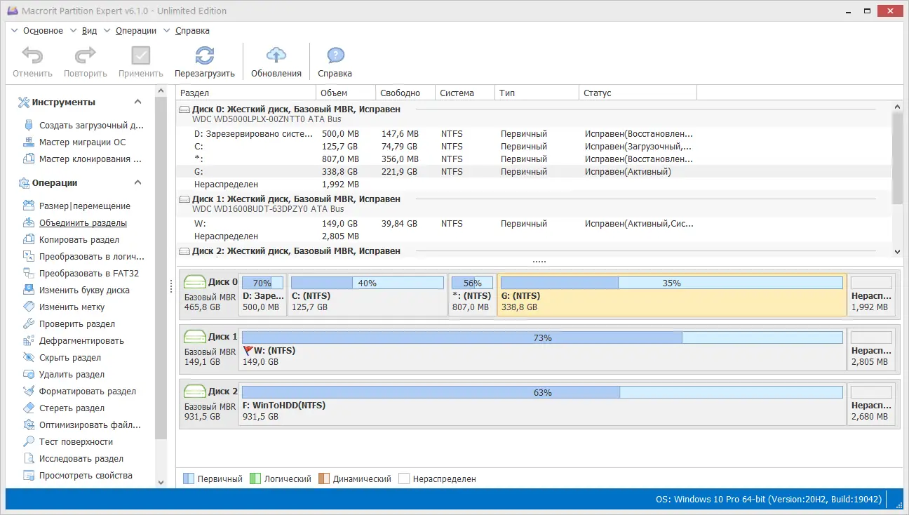 - Гибкое управление задачами: отмена, восстановление данных, возможность просмотра содержимого разделов