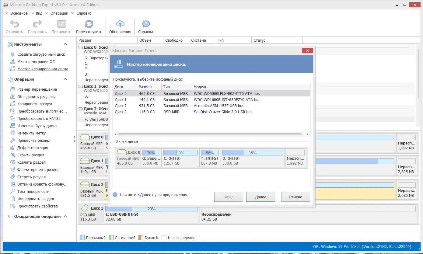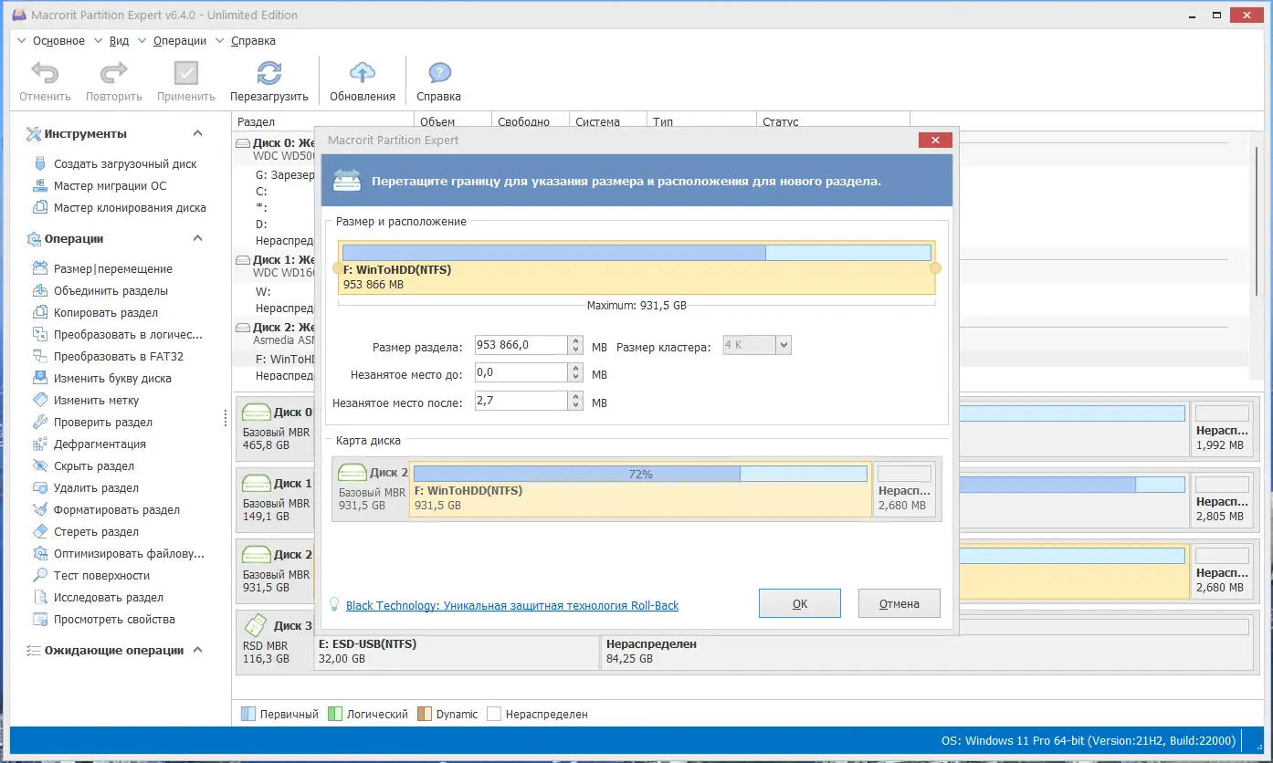 Также программа поддерживает работу с дисками объемом свыше 2 Тб, а благодаря совместимости с системами Windows 7, 8/8.1, 10 и 11, она подходит для различных конфигураций компьютеров на архитектуре x32 и x64 Bit. Возможности полной автоматизации и контроля процесса позволяют выполнять задачи быстро и без ошибок, а автоматическая оптимизация дискового пространства обеспечивает максимальную производительность системы.