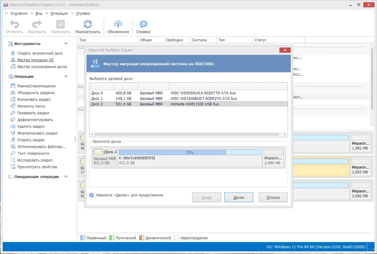 Дополнительно | Рекомендуется наличие подключенного диска для операций с разделами |