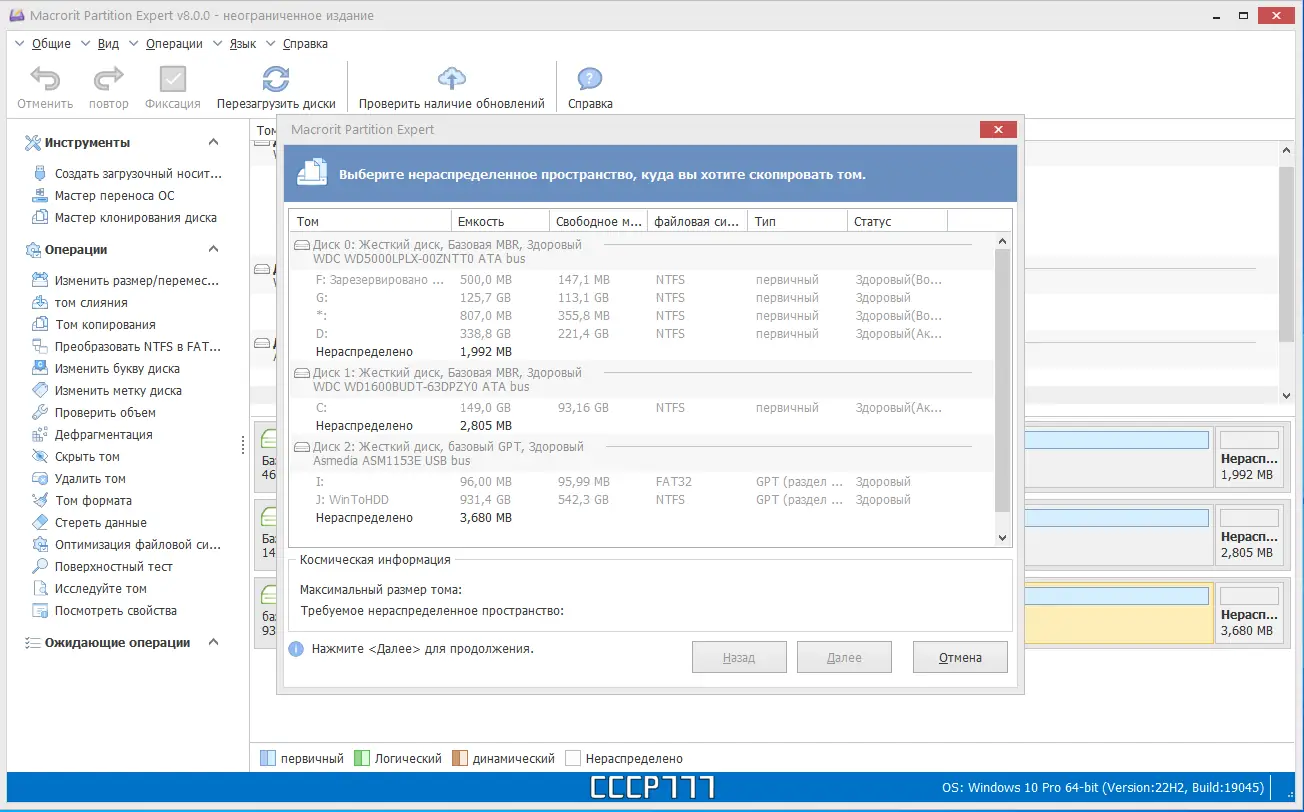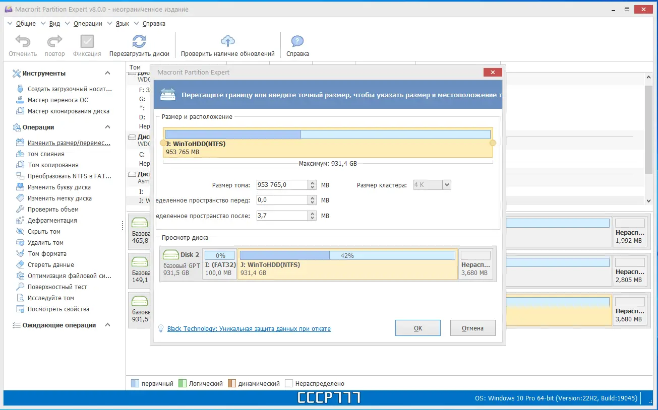 - Работа с GPT и MBR дисками без ограничения по объему и типу конструкции.