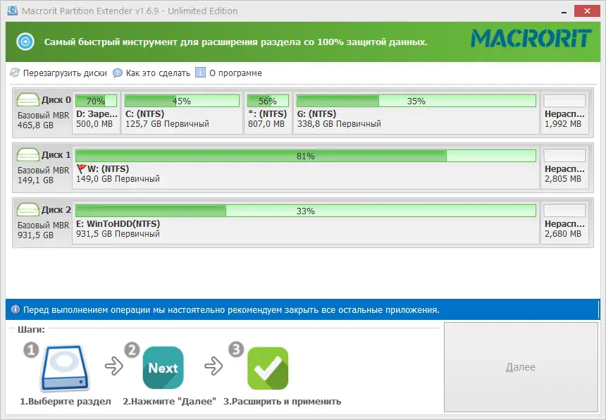 - Некоторые функции (например, расширение очень больших разделов) могут требовать перезагрузки системы;