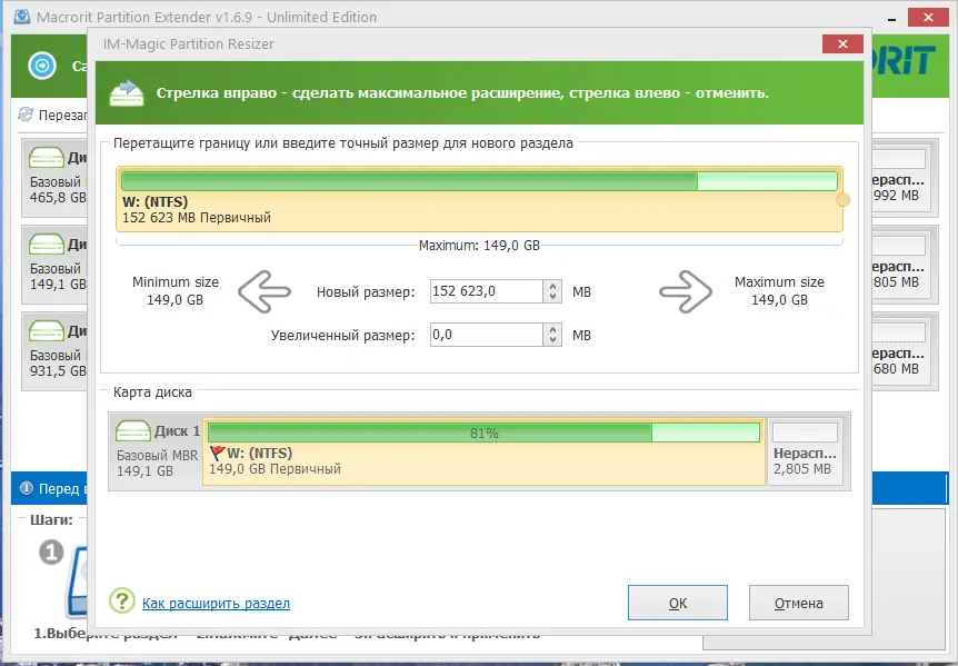 - Может потребоваться достаточное свободное пространство для выполнения расширения без потери данных.