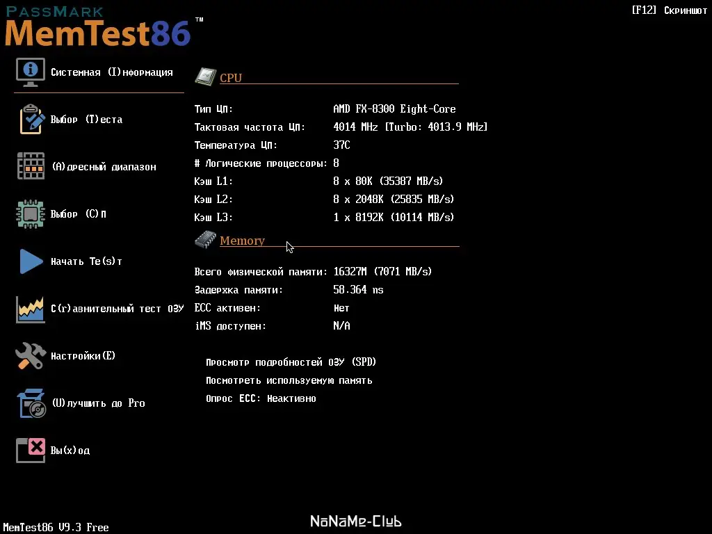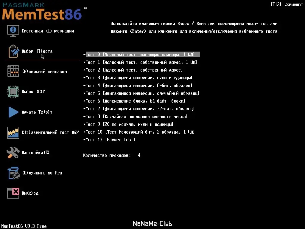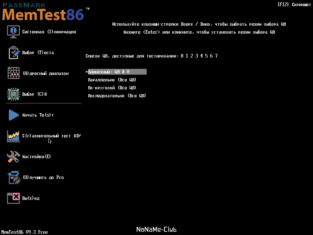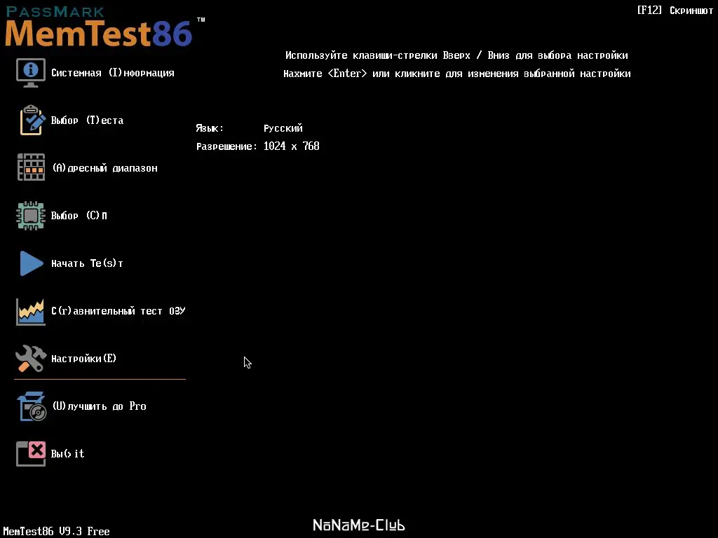 - Запустить загрузку с флешки и выбрать необходимые параметры тестирования.