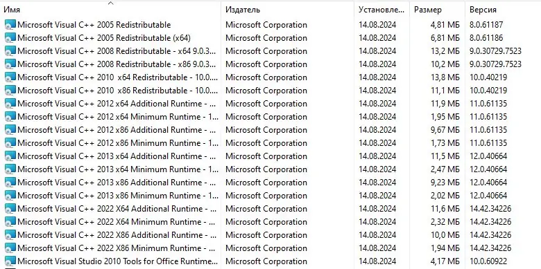Microsoft Visual C++ Runtimes – это установка необходимых компонентов среды выполнения библиотек Visual C++, обеспечивающих корректную работу приложений, созданных с помощью среды программирования Visual Studio. Эти компоненты включают среды выполнения C (CRT), стандартный C++, MFC, C++ AMP и OpenMP, без которых программы, разработанные на Visual Studio, не смогут функционировать на вашей системе.