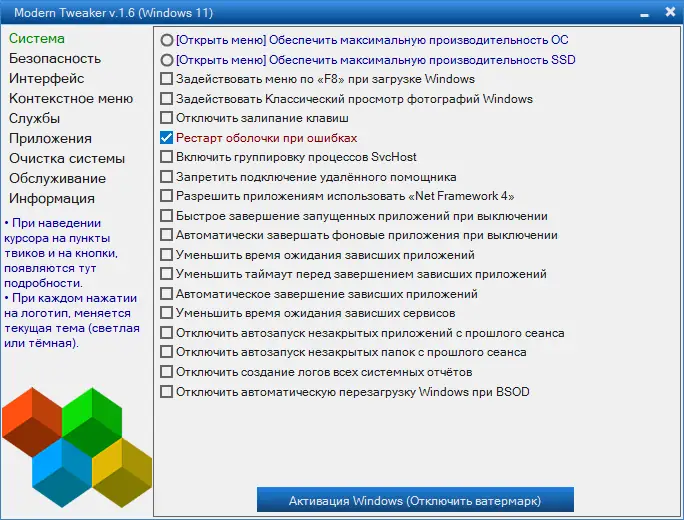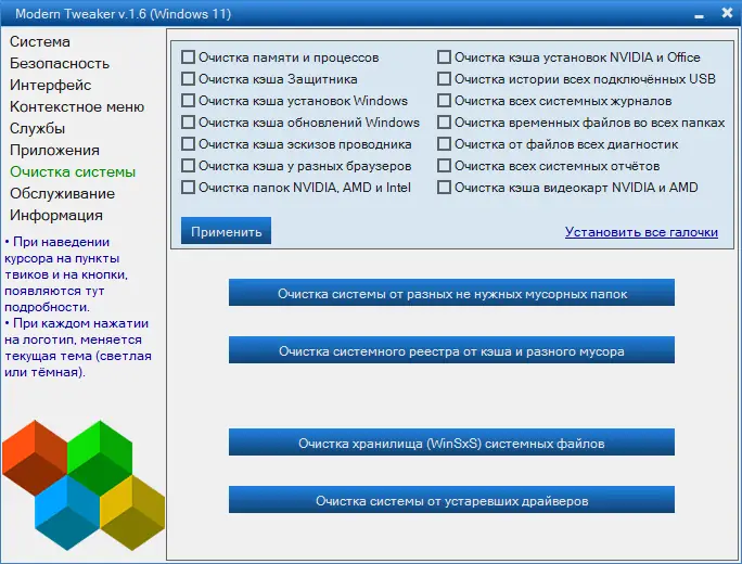 Modern Tweaker — это программная оболочка для твиков Windows, которая позволяет даже неопытным пользователям легко и быстро повысить производительность системы без глубоких знаний в области настройки ОС.