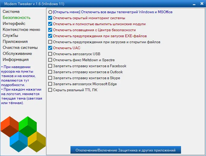 Программа представляет собой современный инструмент для тонкой настройки операционной системы Windows. Используя Modern Tweaker, пользователь сможет оптимизировать внешний вид, интерфейс, безопасность и службы Windows. Более 100 настроек, сгруппированных по вкладкам, позволяют осуществлять точечную работу с системой, настраивая фоновые службы, фоновые приложения и параметры безопасности. Реализована функция отката настроек по вкладкам и активация линейки Windows 10. Версия 1.6 умеет возвращать стандартные значения параметров системы. Программа написана на .Net для обеспечения универсальности и высокого уровня безопасности. Эта программа что это за программа и как она помогает улучшить работу Windows, станет незаменимым инструментом для всех, кто хочет сделать свою систему более быстрой и надежной.
