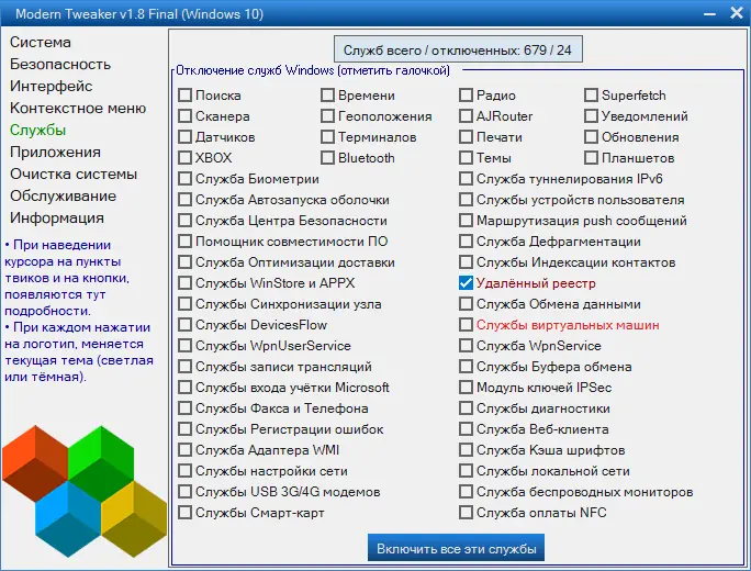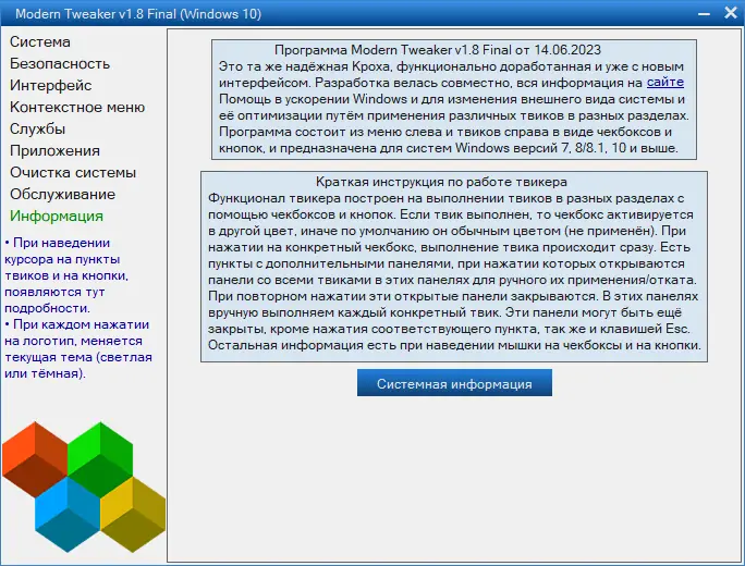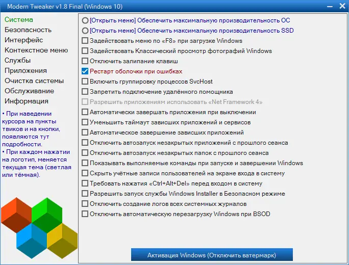 Modern Tweaker — это мощная программная оболочка для твиков Windows, которая позволяет даже неопытным пользователям легко повысить производительность системы.