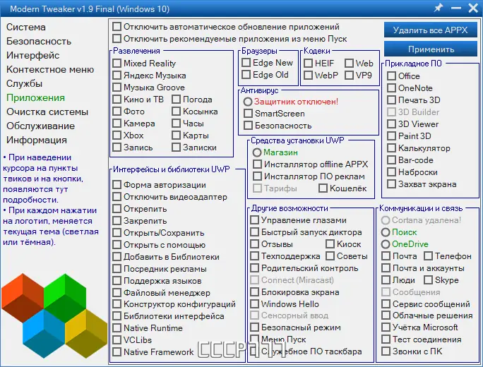 - Реализует механизм отката изменений по разделам: Система, Интерфейс, Безопасность, Службы Windows, Фоновые приложения.