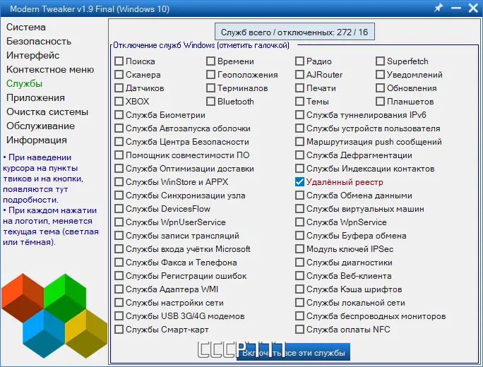 - Группирует твики по вкладкам с более чем 100 настройками для оптимизации работы ПК.