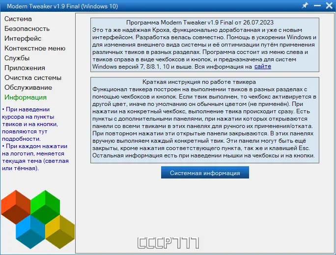 Modern Tweaker — программа, предназначенная для тонкой настройки и оптимизации Windows, позволяющая даже неопытным пользователям повысить производительность системы без необходимости сложных знаний и навыков.