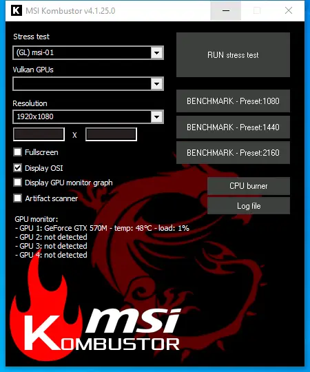 MSI Kombustor — бесплатное приложение для тестирования и оценки производительности видеокарт, которое позволяет провести всестороннее стресс-тестирование графического процессора на различных системах.