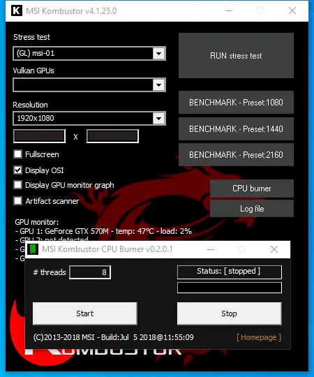 MSI Kombustor разработан командой Geeks3D совместно с компанией MSI и основан на популярном приложении FurMark. Он предназначен для проверки возможностей видеокарт, в том числе не только MSI, с помощью множества тестов, симулирующих максимальные нагрузки. Программа поддерживает работу с технологией OpenGL и Vulkan, предлагая широкий ассортимент тестов, таких как MSI PhysX, TessMark, Phong-Donut и PBR-Donut. В ней есть эталонные стресс-тесты, позволяющие сравнить производительность различных видеокарт и определить их стабильность. Перед запуском тестирования можно настроить параметры отображения графика температуры, выбрать полноэкранный режим и другие опции. В процессе выполнения отображается визуальная составляющая тестов и информация о температуре видеокарты, FPS, загрузке GPU и памяти.