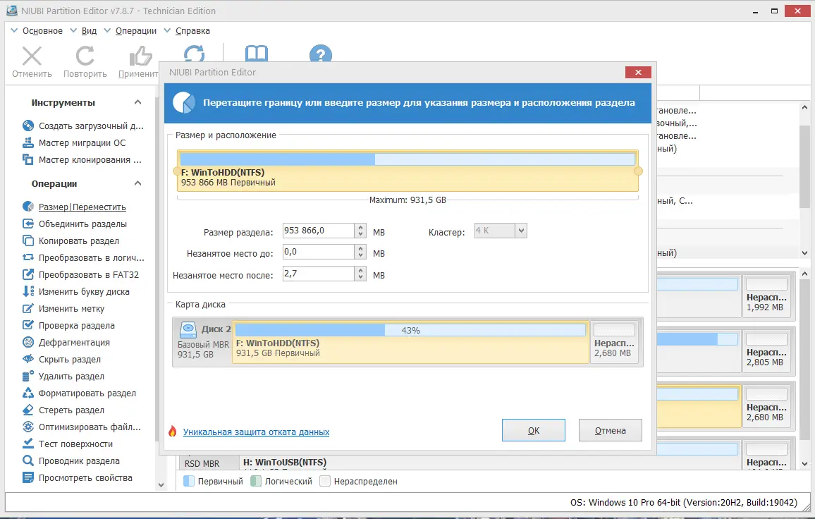 - Безопасное изменение размеров разделов, расширение NTFS без перезагрузки.