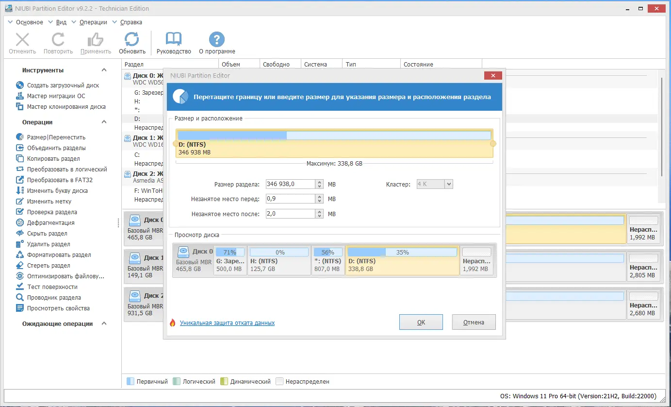 - Безопасное изменение размера разделов, в том числе расширение NTFS без перезагрузки.