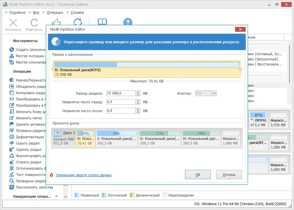 - Безопасное изменение размера разделов, включая расширение NTFS разделов без перезагрузки системы.