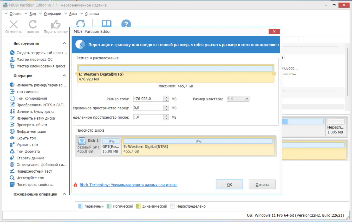 - Безопасное изменение размера разделов NTFS без перезагрузки.