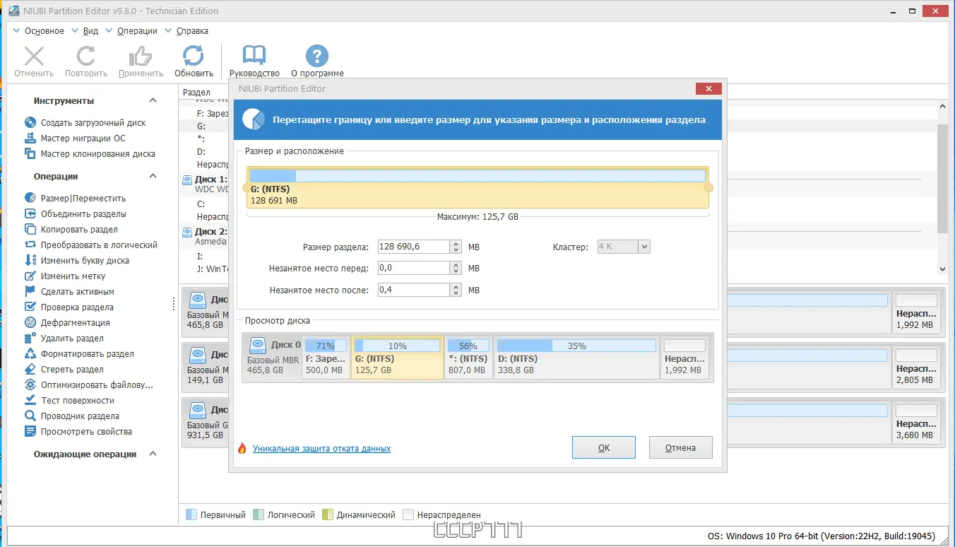 - Безопасное изменение размеров разделов, включая расширение NTFS без перезагрузки и копирование разделов для переносов данных.