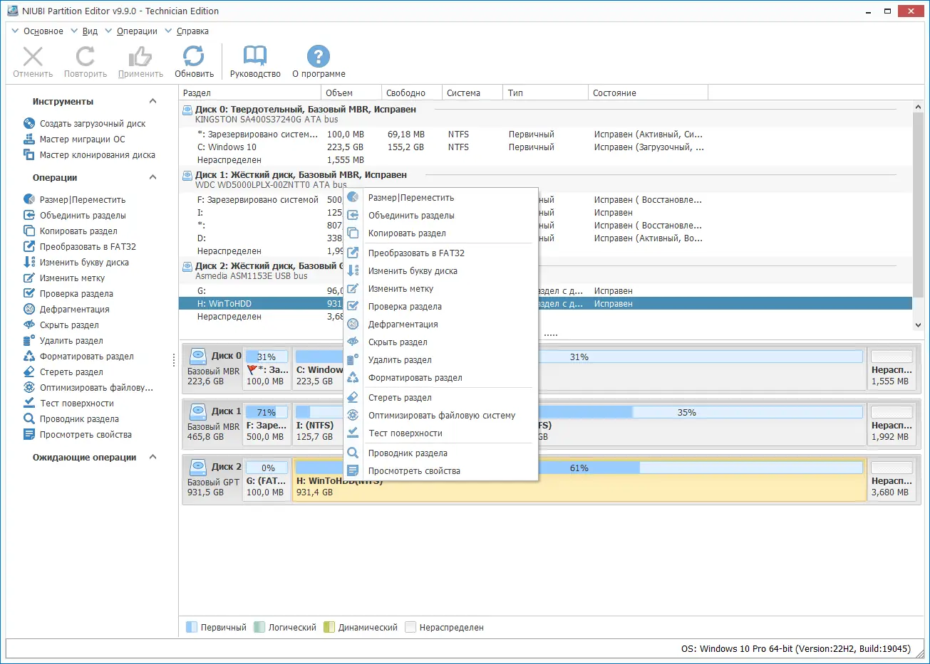 - Конвертация между логическими и основными разделами, а также NTFS в FAT32