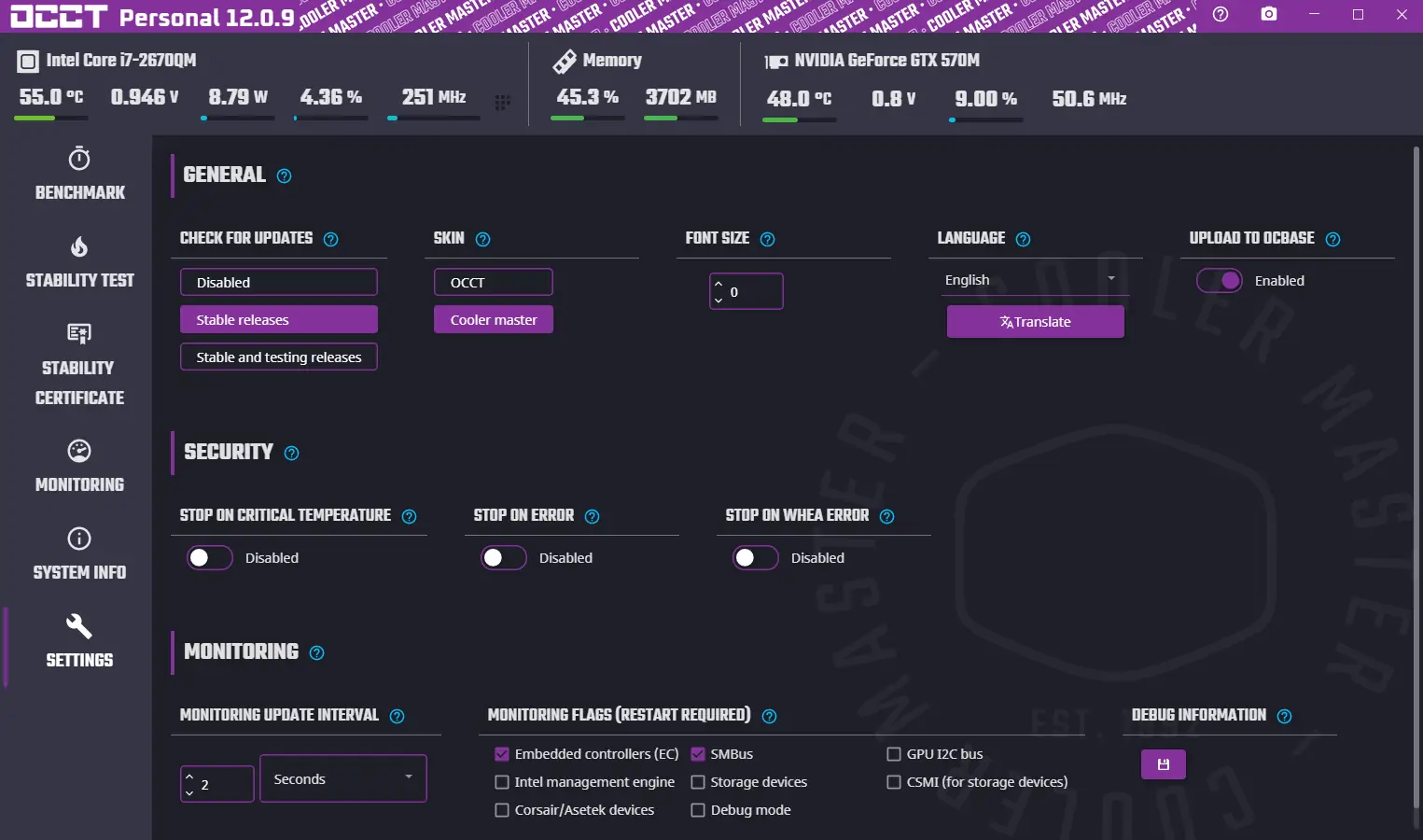 Перед запуском рекомендуется убедиться в чистоте системы охлаждения, чтобы избежать перегрева во время стресс-тестов. В программе реализована возможность выбора темы оформления — стандартная или Coolermaster, что позволяет адаптировать интерфейс под предпочтения пользователя.