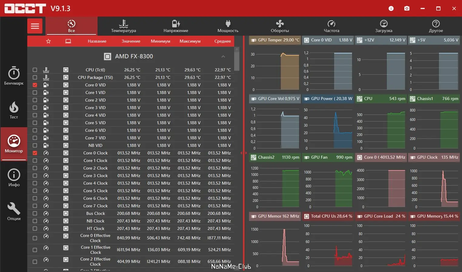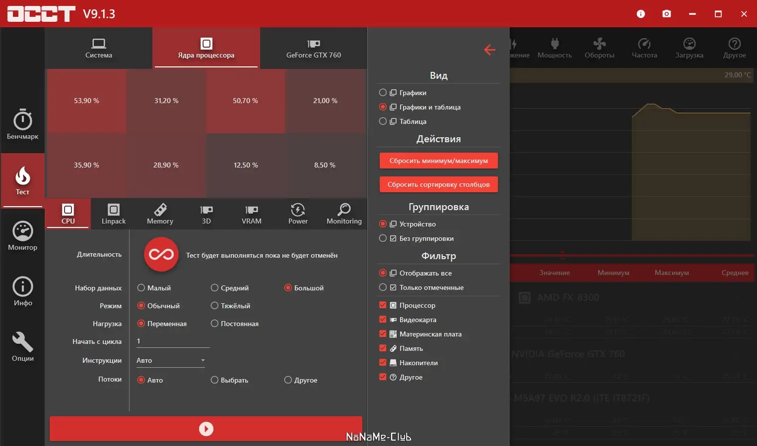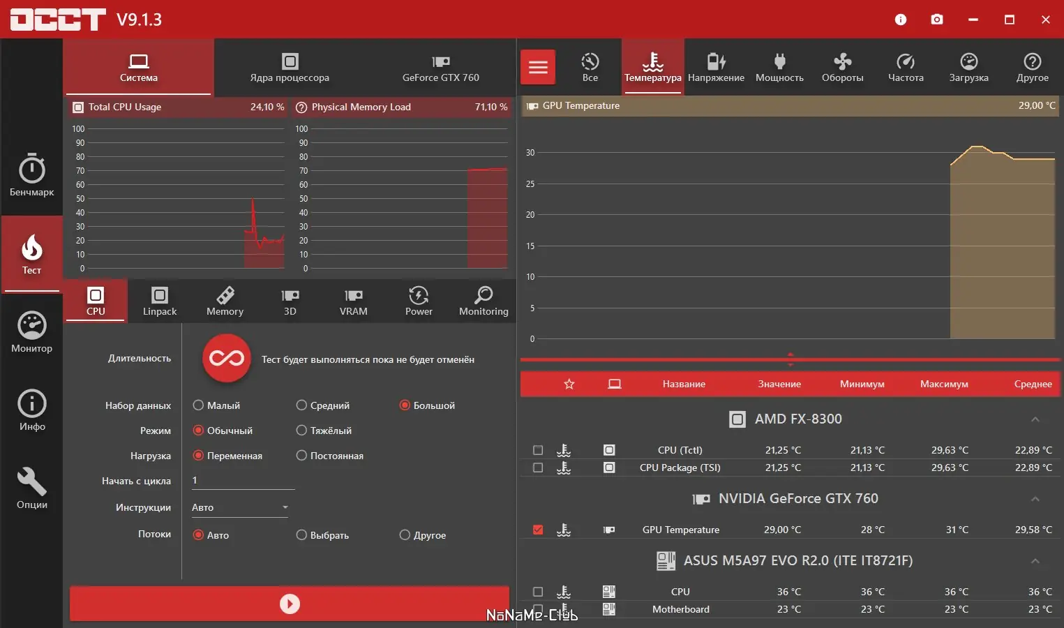- Мониторинг температуры и рабочих параметров компонентов через сторонние программы мониторинга