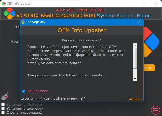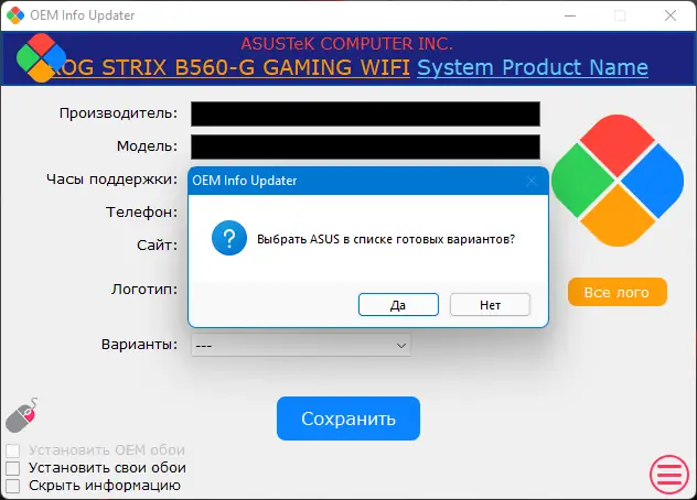Бесплатная программа для изменения OEM информации в системах Windows, позволяющая легко редактировать данные производителя, модели, логотипа и других параметров без необходимости установки.