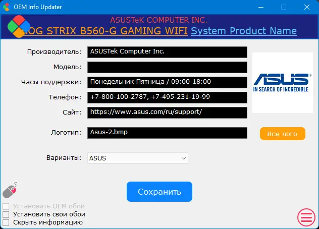 OEM Info Updater — это простое и удобное решение для обновления OEM информации в операционной системе Windows. Она предназначена для быстрого и безопасного изменения данных о производителе, модели, часах поддержки, контактных данных, логотипах и другой информации, которая отображается в свойствах системы. Программа автоматически определяет язык интерфейса в зависимости от настроек системы, предоставляя поддержку русского и английского языков. В комплект входит богатый набор готовых логотипов и вариантов оформления с возможностью загрузки собственных изображений. Для пользователей из Украины и Белоруссии предусмотрены отдельные сведения поддержки, что делает работу с программой максимально удобной и актуальной.