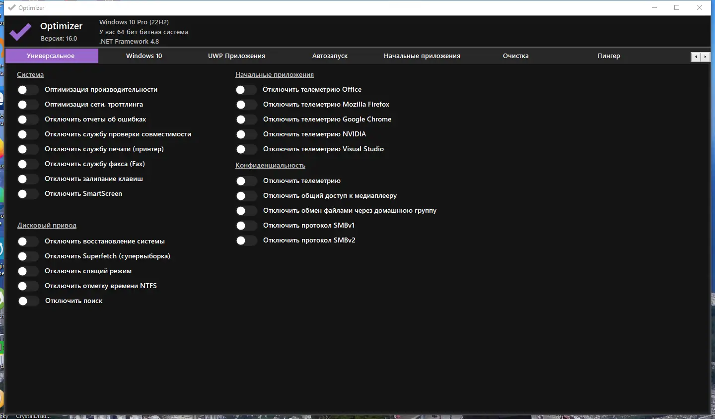 - Инструменты для отключения телеметрии, автоматических обновлений и ненужных служб