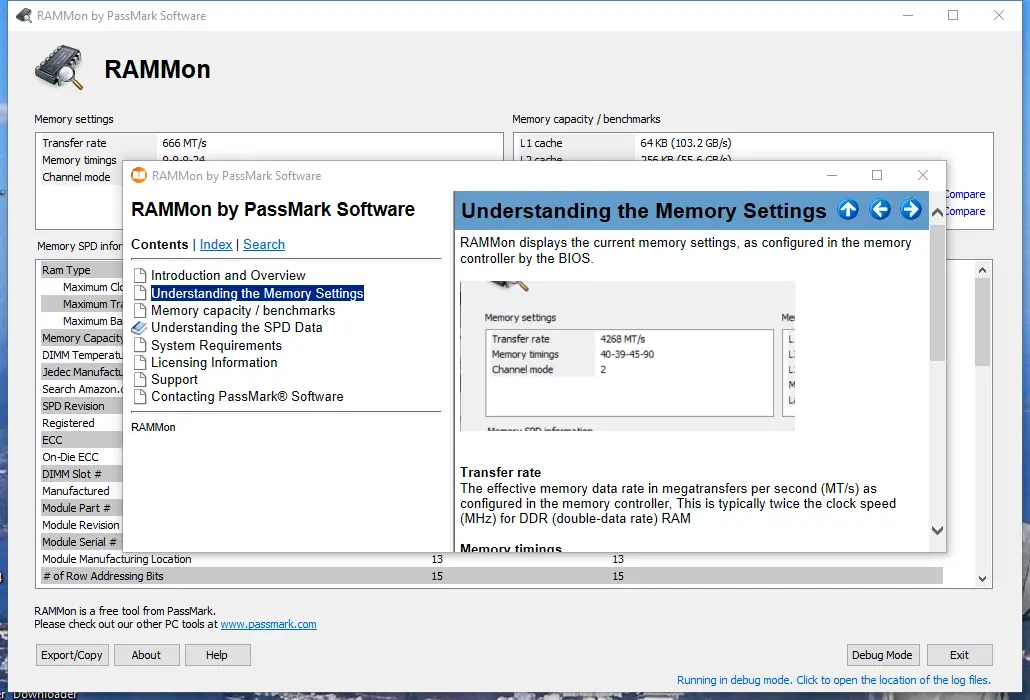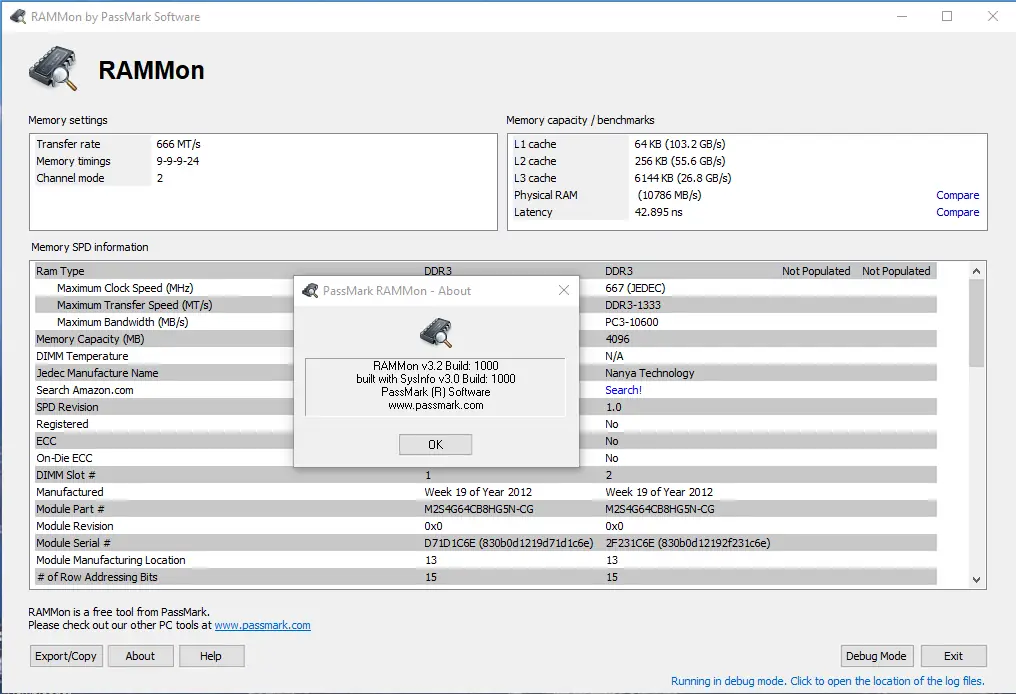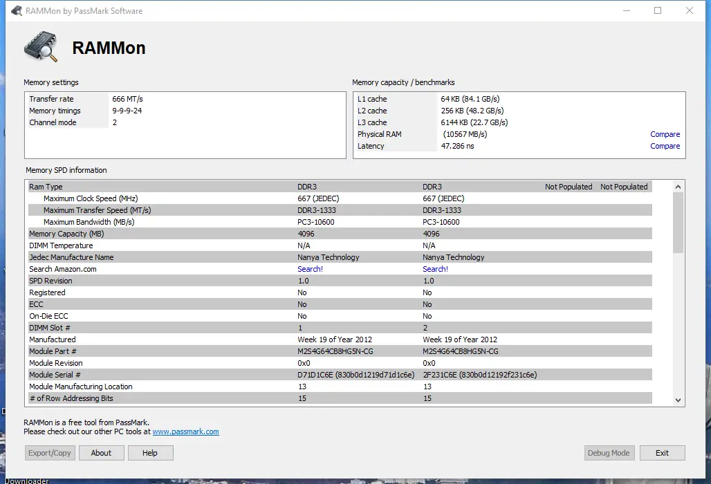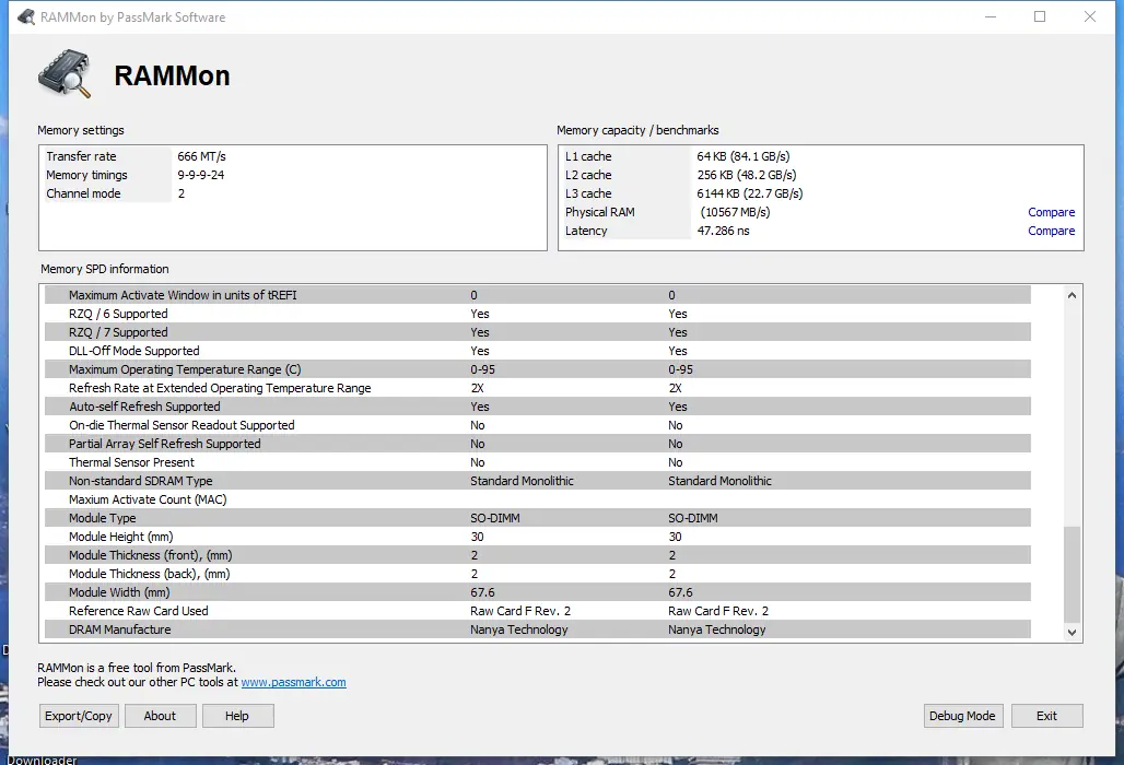 PassMark RAMMon — это утилита, предназначенная для получения подробной информации о памяти вашего компьютера. Она позволяет быстро и удобно получить данные о каждом установленном модуле оперативной памяти, включая производителя, тип, тактовую частоту, серийный номер, объем и температуру.