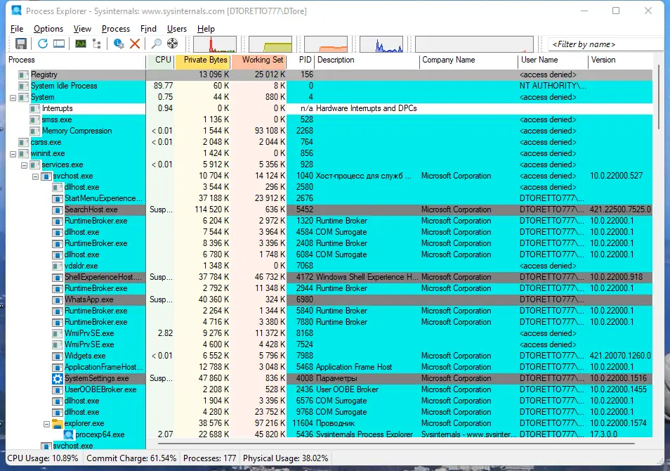 - Цветовая подсветка системных служб, процессов .net и процессов с одинаковой учетной записью