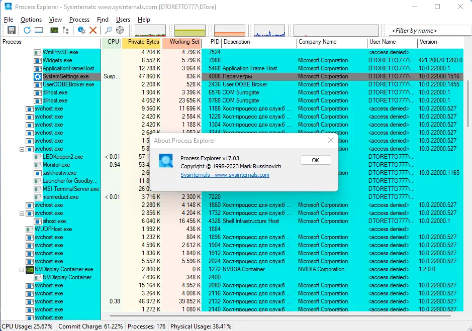 Process Explorer — это мощная утилита, разработанная компанией sysinternals, предоставляющая расширенные возможности по сравнению с стандартным диспетчером задач Windows 7, 8/8.1, 10 и 11. Она позволяет подробно анализировать процессы, отображая их полный путь, инициализаторов автозапуска, статистику использования ресурсов, а также интеграцию с VirusTotal для оценки безопасности. В отличие от обычного диспетчера задач, программа показывает список DLL и дескрипторов, используемых процессом, а также обеспечивает поиск процессов по файлам, каталогам или ключам реестра. Возможность перестраивать столбцы и настраивать отображение информации делает инструмент гибким и удобным для системных администраторов и продвинутых пользователей.