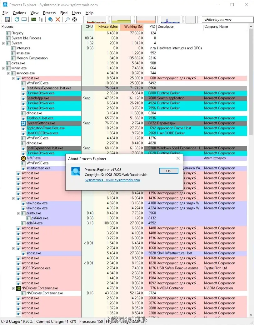 Process Explorer — это расширенная и бесплатная утилита для управления запущенными процессами в Windows различной версии, включая Windows 7, 8/8.1, 10 и 11, поддерживающая как 32-битные, так и 64-битные системы. Этот инструмент превосходит по возможностям стандартный Диспетчер задач, предоставляя расширенную информацию о каждом процессе, включая путь выполнения, автозагрузки, атрибуты безопасности и показатели использования ресурсов системы.