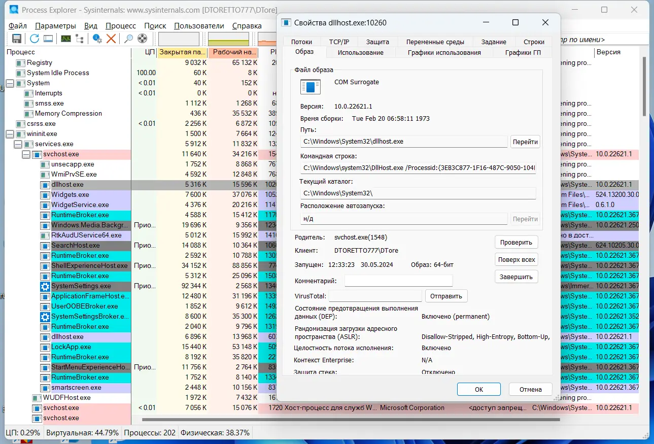 Process Explorer позволяет подробно изучить все запущенные процессы, отображая их полные пути, инициализаторов автозапуска, статистику использования ресурсов и атрибуты безопасности. Программа может показать список DLL и дескрипторов, используемых каждым процессом, а также интегрирована с функциями поиска по файлам, каталогам и реестру. Опция «найти цель» позволяет перетащить указатель на окно или объект и быстро определить его владельца, что особенно полезно при выявлении майнеров или подозрительных процессов. Возможность полной перестройки отображаемой информации дает администраторам возможность настроить интерфейс под свои нужды.